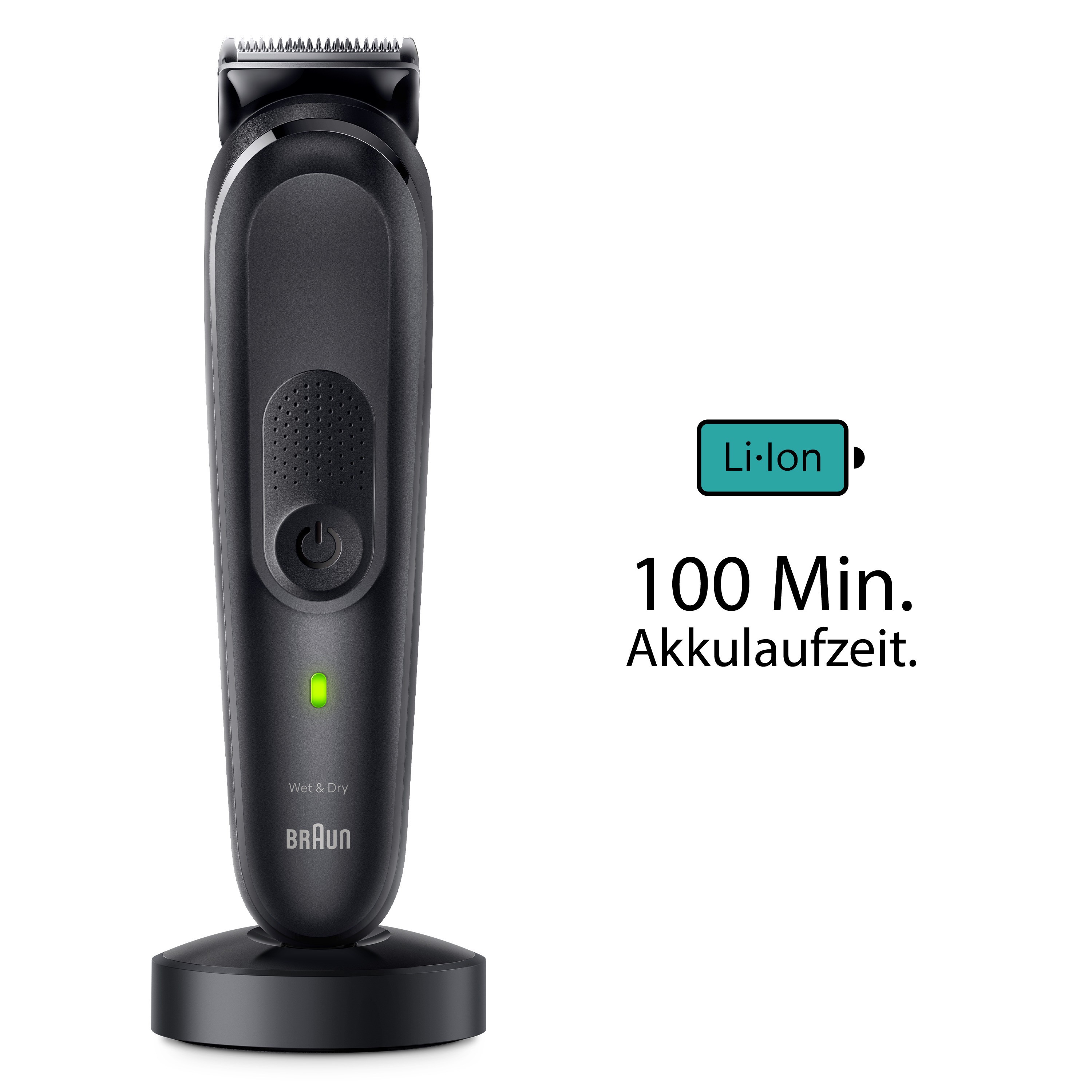 Mit einem leistungsstarken Lithium-Ionen-Akku ausgestattet, bietet das Körperpflege Set eine kabellose Laufzeit von 100 Minuten. Zudem ist das Gerät zu 100% wasserdicht, was eine flexible Anwendung sowohl im Trockenen als auch unter der Dusche ermöglicht.