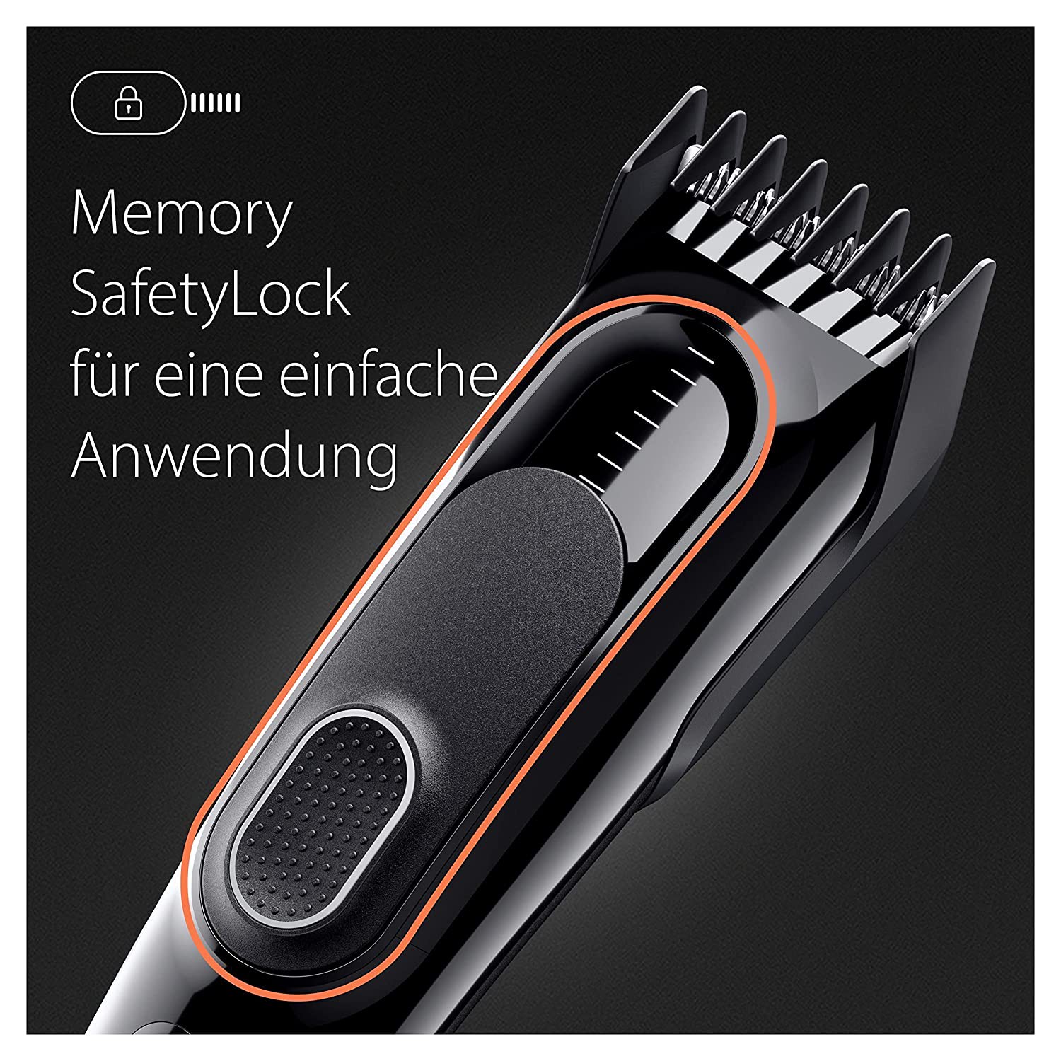 • 9 Längen: Wahlweise mit oder ohne Kammaufsatz. Memory SafetyLock speichert die zuletzt verwendete Einstellung für einfaches Haare trimmen zu Hause