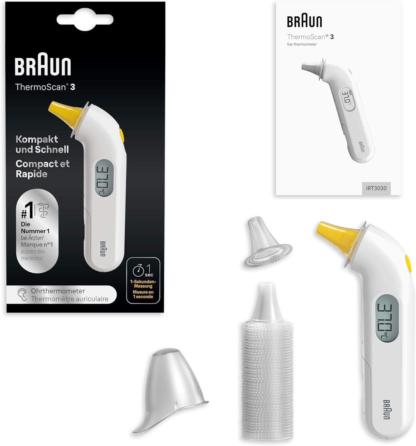 Dieses kompakte ThermoScan 3 (IRT 3030) Ohrthermometer von Braun lässt sich einfach und bequem bedienen. Es liefert eine genaue Messung innerhalb von 1 Sekunde!