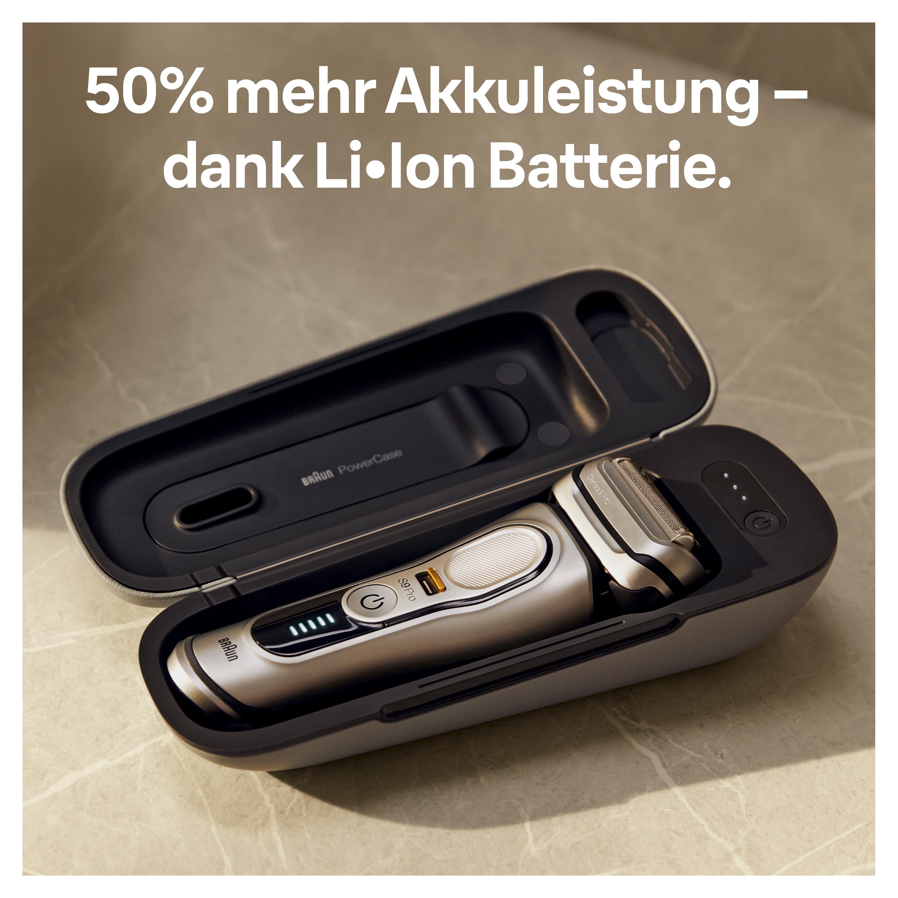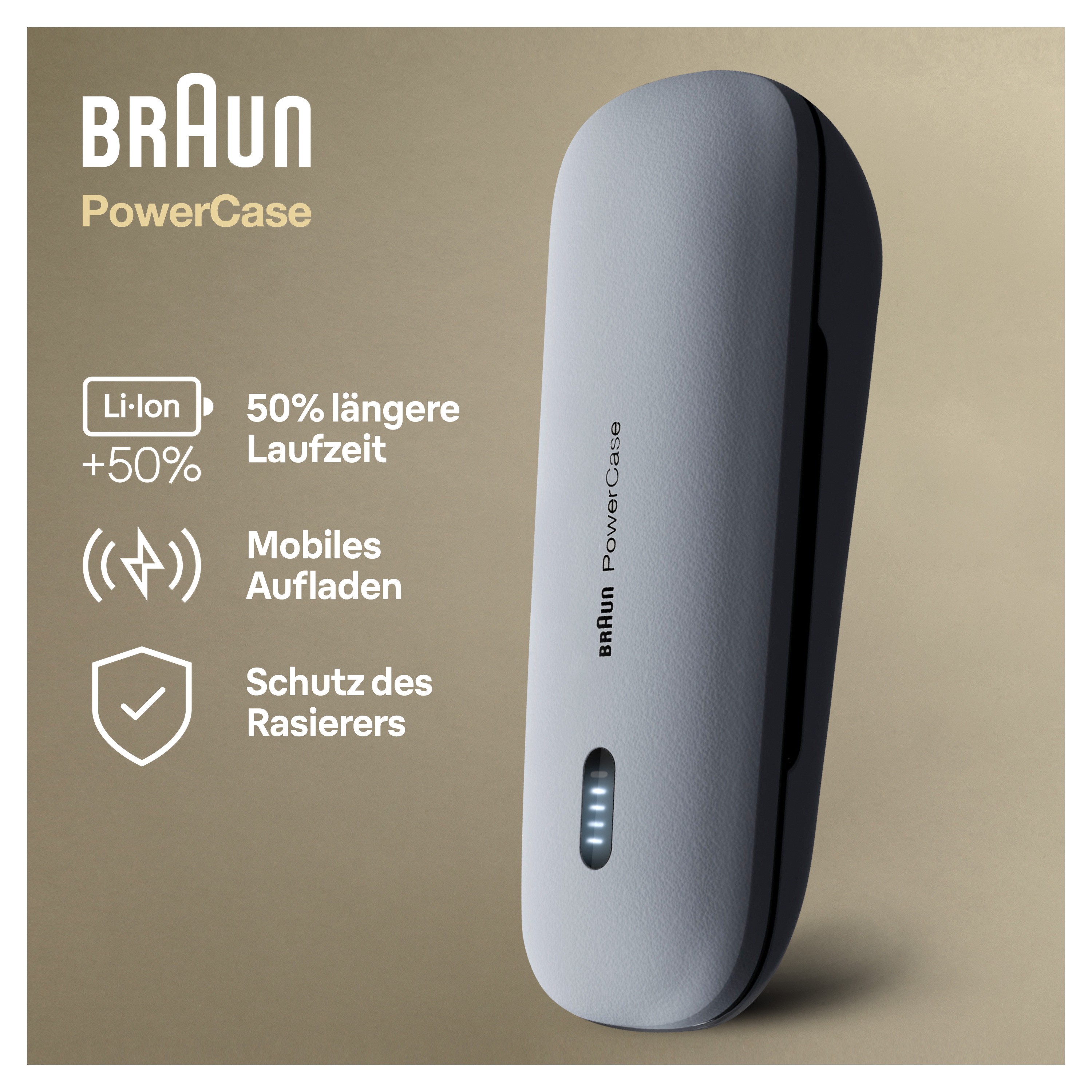 Das Braun PowerCase ist das weltweit erste tragbare Lade-Etui für Rasierer, das Ihnen bis zu 6 Wochen kabelloses Rasieren ermöglicht. Mit einem leistungsstarken integrierten Lithium-Ionen-Akku bietet es eine um 50% verlängerte Akkulaufzeit, sodass Sie jederzeit und überall für eine perfekte Rasur bereit sind.