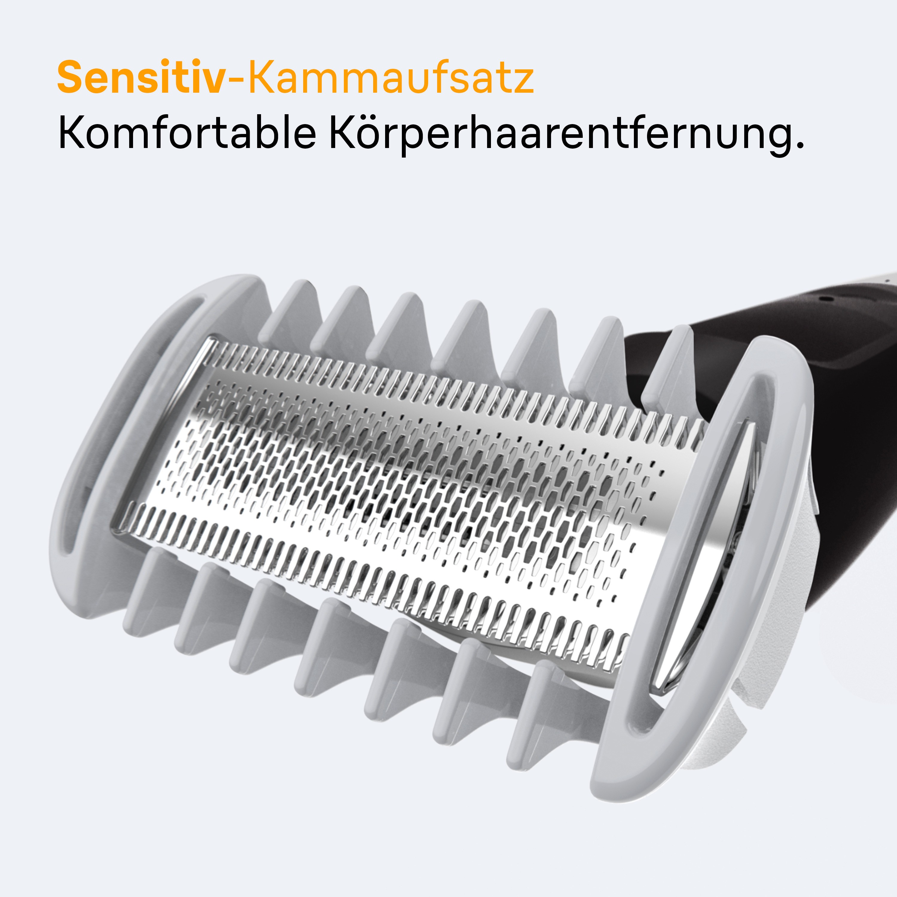 Dieses Gerät vereint Barttrimmer, Bodygroomer und Elektrorasierer in einem. Es eignet sich für das Trimmen, Stylen und Rasieren verschiedener Haarlängen und -bereiche. Mit mehreren Kammaufsätzen kann das Gerät individuell angepasst werden.
