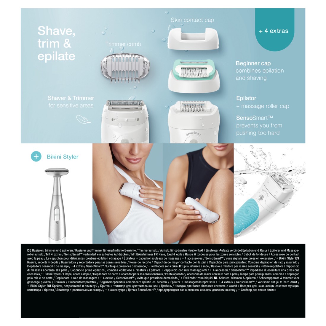 Der Epilierer ist 100% wasserdicht und kann daher sowohl trocken als auch unter Wasser verwendet werden, was besonders in der Badewanne oder Dusche für eine schmerzreduzierte Epilation sorgt. Mit zusätzlichen Aufsätzen für das Rasieren und Trimmen ist das Gerät vielseitig einsetzbar und eignet sich auch für empfindliche Bereiche.