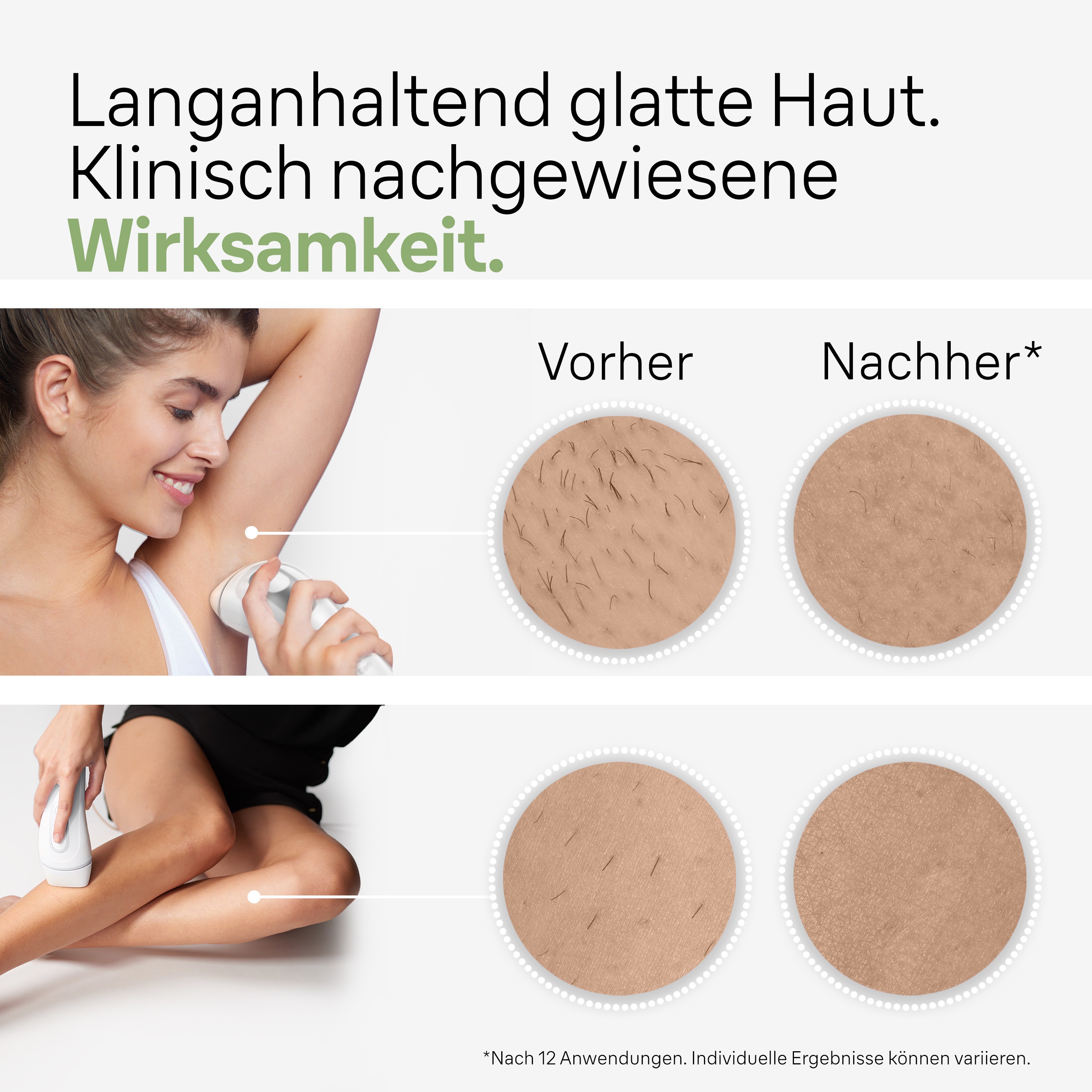 Erlebe bis zu ein Jahr lang seidig-glatte Haut. Der Silk·expert Pro 3 nutzt die fortschrittliche IPL-Technologie, um nach nur drei Anwendungen sichtbare Ergebnisse zu liefern. Die Behandlung ist schnell, präzise und sanft zur Haut.