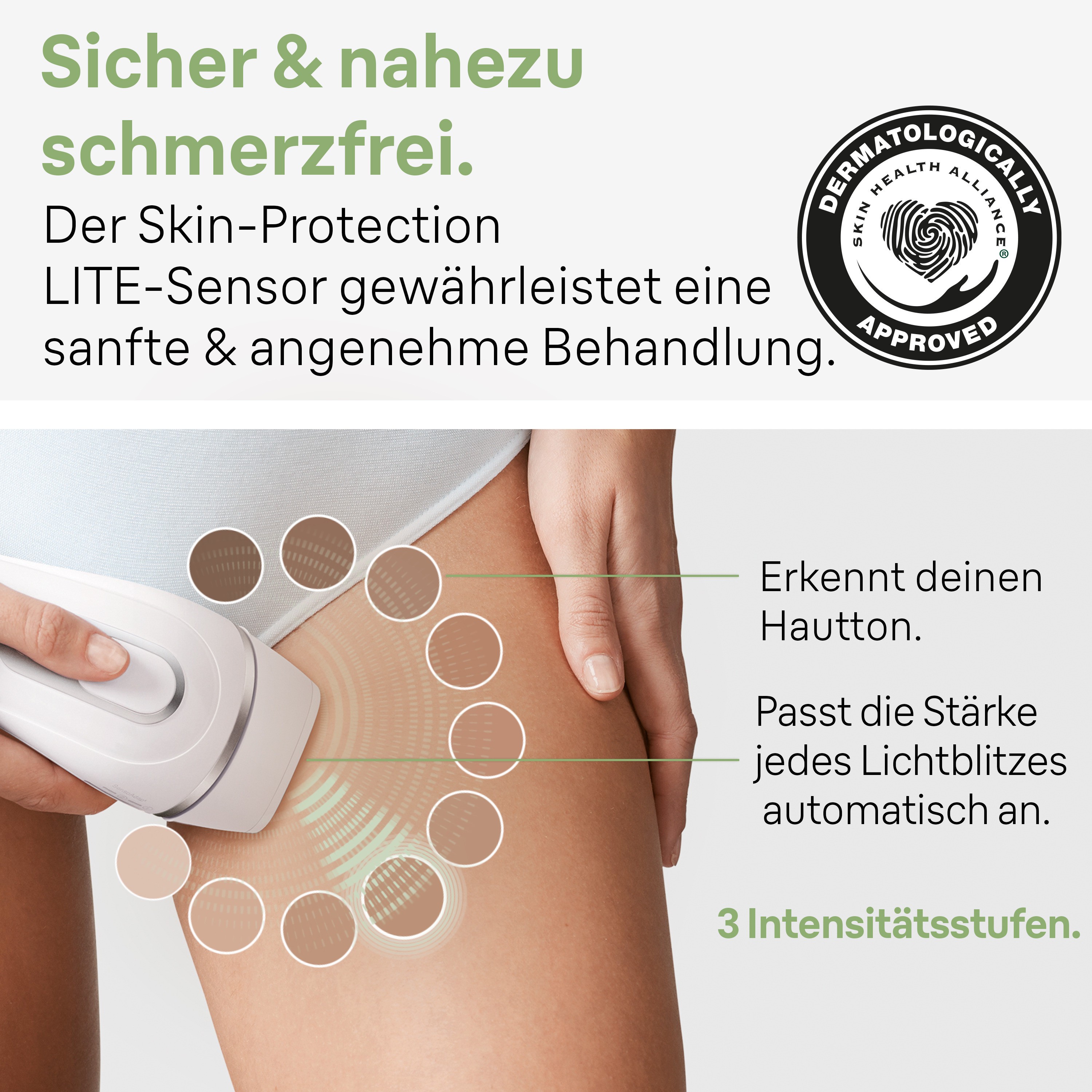 Der Silk·expert Pro 3 bietet optimale Leistung für alle Körperstellen. Dank der SkinProtection LITE Technologie passt sich das Gerät automatisch und kontinuierlich an deinen Hautton an, um die beste mögliche Behandlung zu gewährleisten.