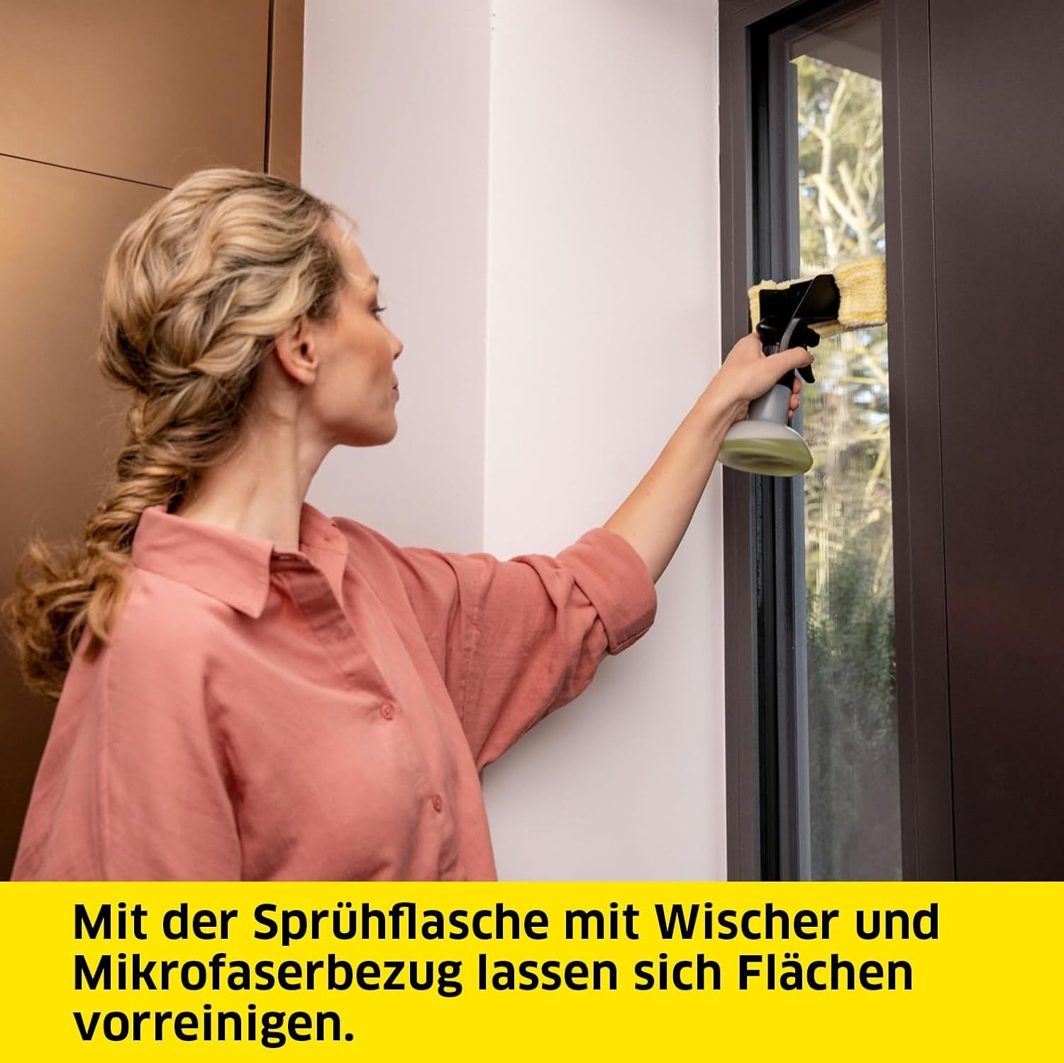 • Zur Vorreinigung befindet sich im Set eine Sprühflasche mit Wischer samt Mikrofaserbezug.