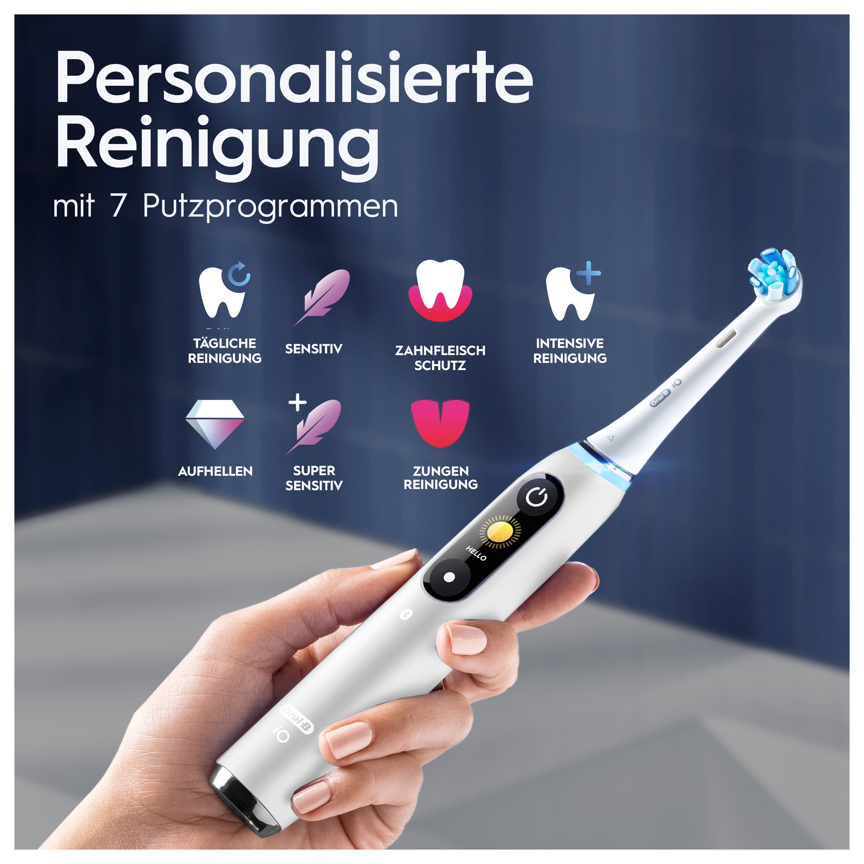 Die Oral-B iO verfügt über ein interaktives Farbdisplay, das die Auswahl aus verschiedenen Putzprogrammen ermöglicht, die Putzzeit trackt und nützliche Erinnerungen bietet. Die intelligente Andruckkontrolle schützt das Zahnfleisch, indem sie den Nutzer bei zu starkem oder zu schwachem Druck warnt.