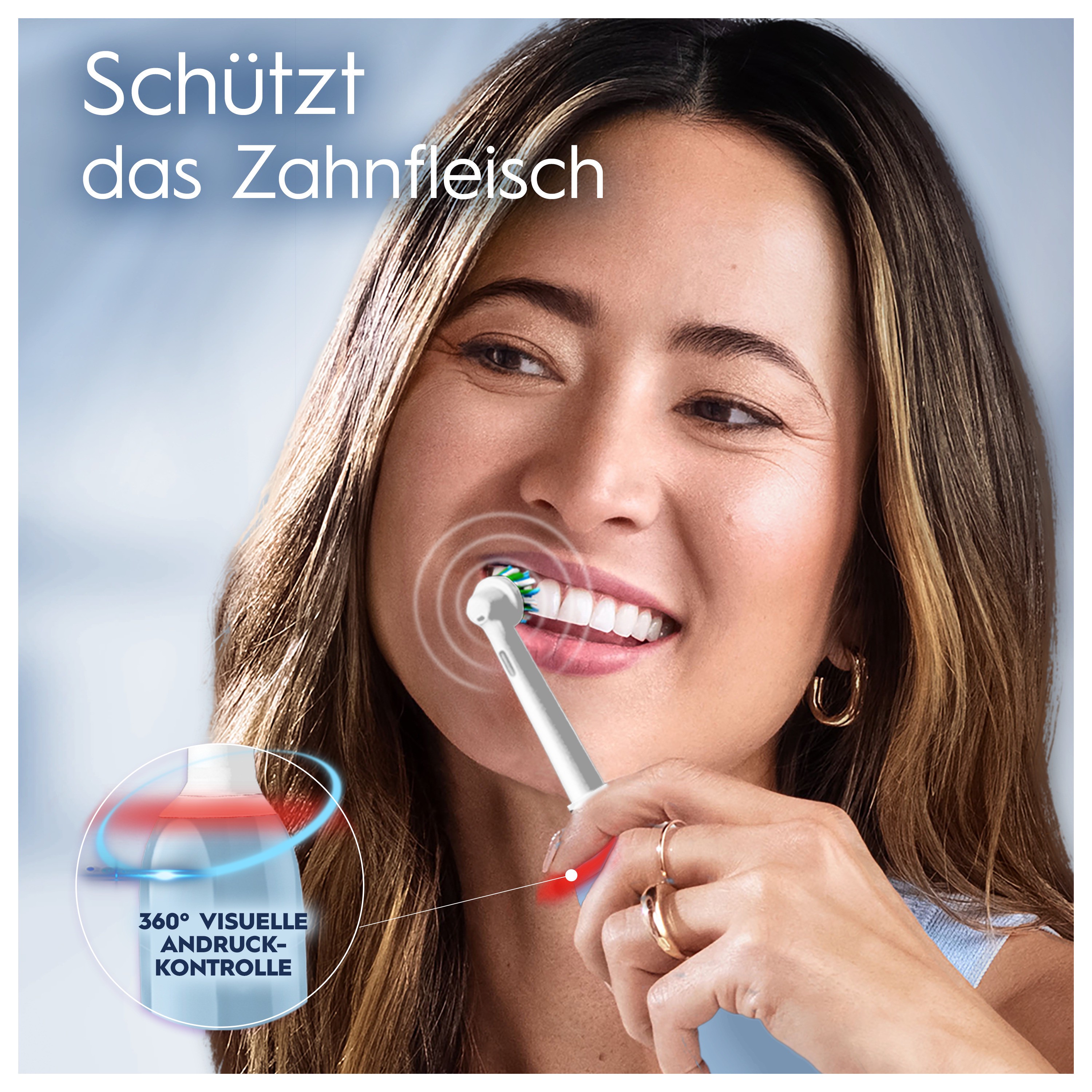 Die Oral-B Pro Series 3 ist mit einer 360°-Andruckkontrolle ausgestattet, die durch Aufleuchten vor zu starkem Putzdruck warnt und automatisch die Putzgeschwindigkeit reduziert. Dies schützt Ihr Zahnfleisch vor Verletzungen und sorgt für eine sichere Reinigung.