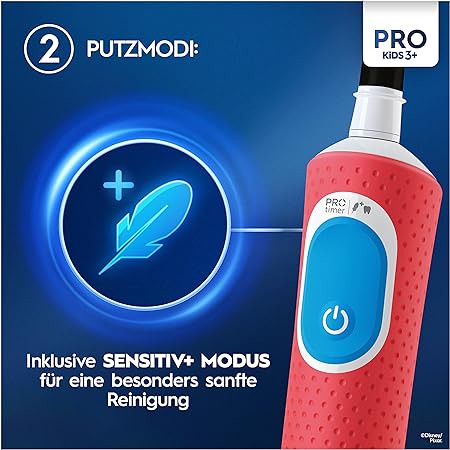 Die Oral-B Pro Kids elektrische Kinderzahnbürste für Kinder ab 3 Jahren sorgt mit individuellen Lieblingshelden für mehr Spaß beim Zähneputzen und gleichzeitig für eine sanfte, effektive Zahnreinigung und Zahnpflege. Mit den extra weichen Borsten und dem einzigartigen, kinderfreundlichen Sensitiv+ Modus wird das empfindliche Zahnfleisch geschützt und die Zähne sanft gereinigt. Die elektronische Zahnbürste entfernt mehr Plaque als eine herkömmliche Handzahnbürste. Im Lieferumfang sind 4 verschiedene Sticker enthalten, die Ihr Kind auf das Handstück kleben kann.