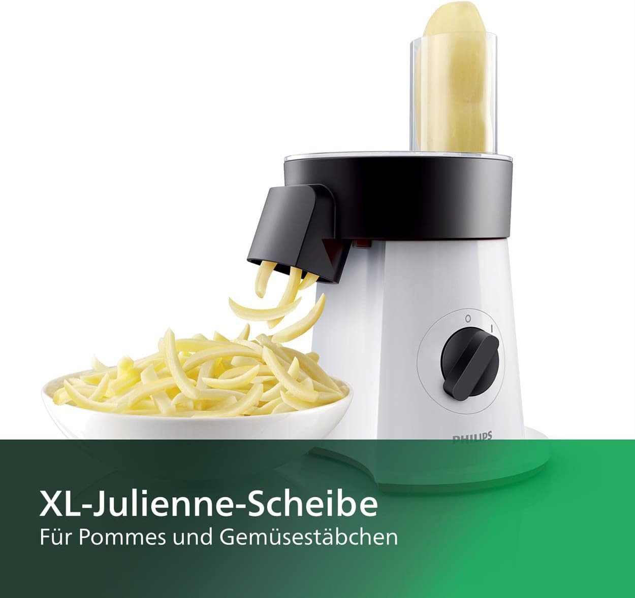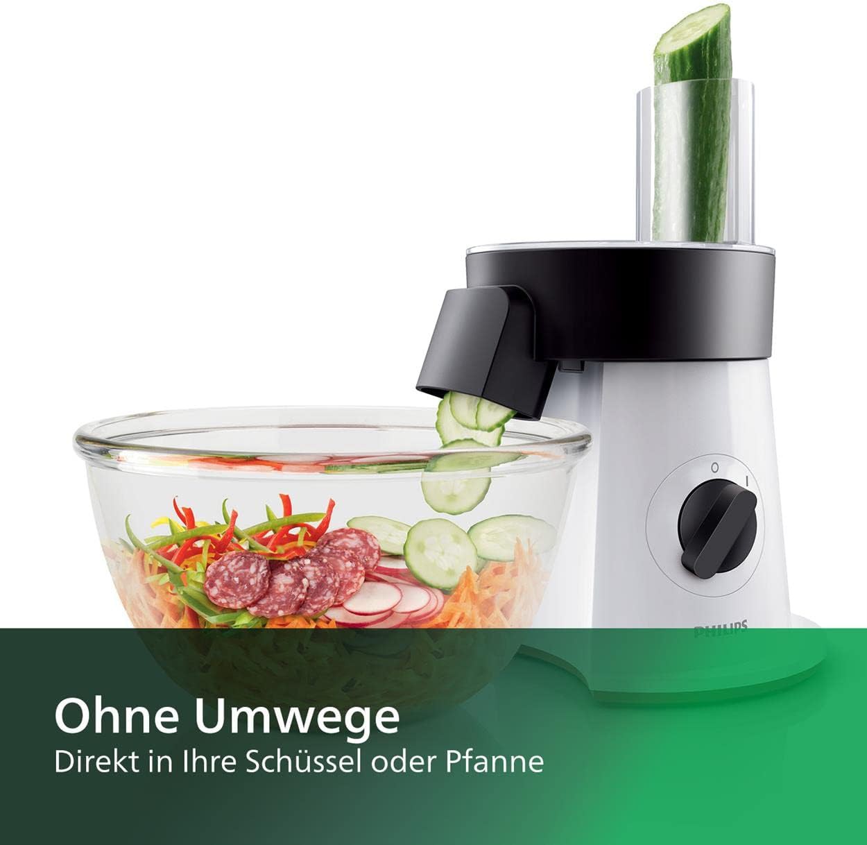 Perfekte Ergebnisse in jeder Form und Größe in Sekunden: Der Philips SaladMaker kombiniert einen leistungsstarken 200-Watt-Motor mit 6 Scheibeneinsätzen aus Edelstahl. Er kann Ihre Lieblingszutaten in jede Form und Größe schneiden. Es war noch nie so leicht, Ihren Lieblingssalat selbst zuzubereiten, genau so, wie Sie ihn mögen! 6 Scheiben für Schneiden, Raspeln und Zerkleinern. Wählen Sie einfach eine Scheibe aus, und stecken Sie diese auf den Scheibenhalter, bis sie einrastet. Eine zusätzliche Scheibe schneidet Pommes Frites und ermöglicht damit endlose Variationen. Direkt servierfertig: Durch die große Öffnung können Sie Zutaten direkt in die Schüssel schneiden. So können Sie die gewünschte Anzahl an Portionen in einem Arbeitsschritt zubereiten. Spülmaschinenfeste Teile: Alle Zubehörteile des Philips SaladMaker können in der Spülmaschine gereinigt werden. Kraftvolle Verarbeitung: Dieser Philips SaladMaker bietet einen leistungsstarken 200 W-Motor, mit dem Sie Ihre Lieblingsgerichte zubereiten können. Bes. große Einfüllöffnung: Die besonders große Einfüllöffnung ermöglicht leichte und schnelle Verarbeitung der Zutaten Maximale Vielseitigkeit: Verarbeitet all Ihre Lieblingszutaten, von Gemüse und Käse bis hin zu Kartoffeln und Fleisch.