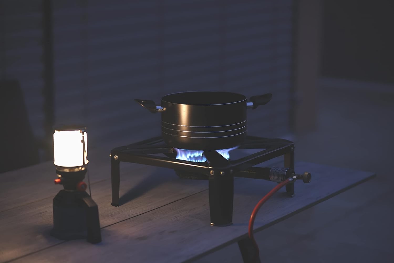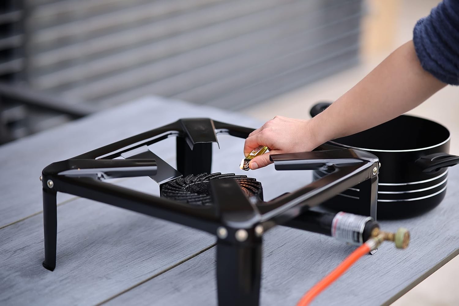 Der windstabile Brenner aus massivem Gusseisen und das stabile Gestell aus Stahlblech sorgen für eine sichere Anwendung im Freien. Der Kocher ist für eine maximale Belastung von 50 kg ausgelegt.