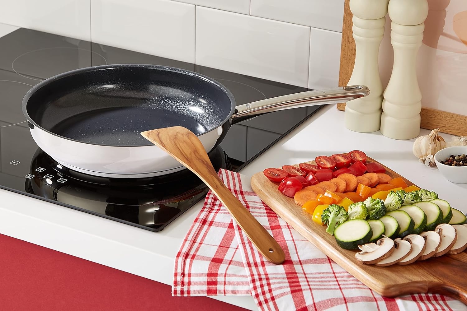 Edelstahl mit keramischer CeraProtect Antihaftbeschichtung, beste Antihafteigenschaften auch bei wenig Fett, extrem hitzebeständig bis 400°C, PTFE-PFOA frei, vielseitig verwendbar für jedes Gericht