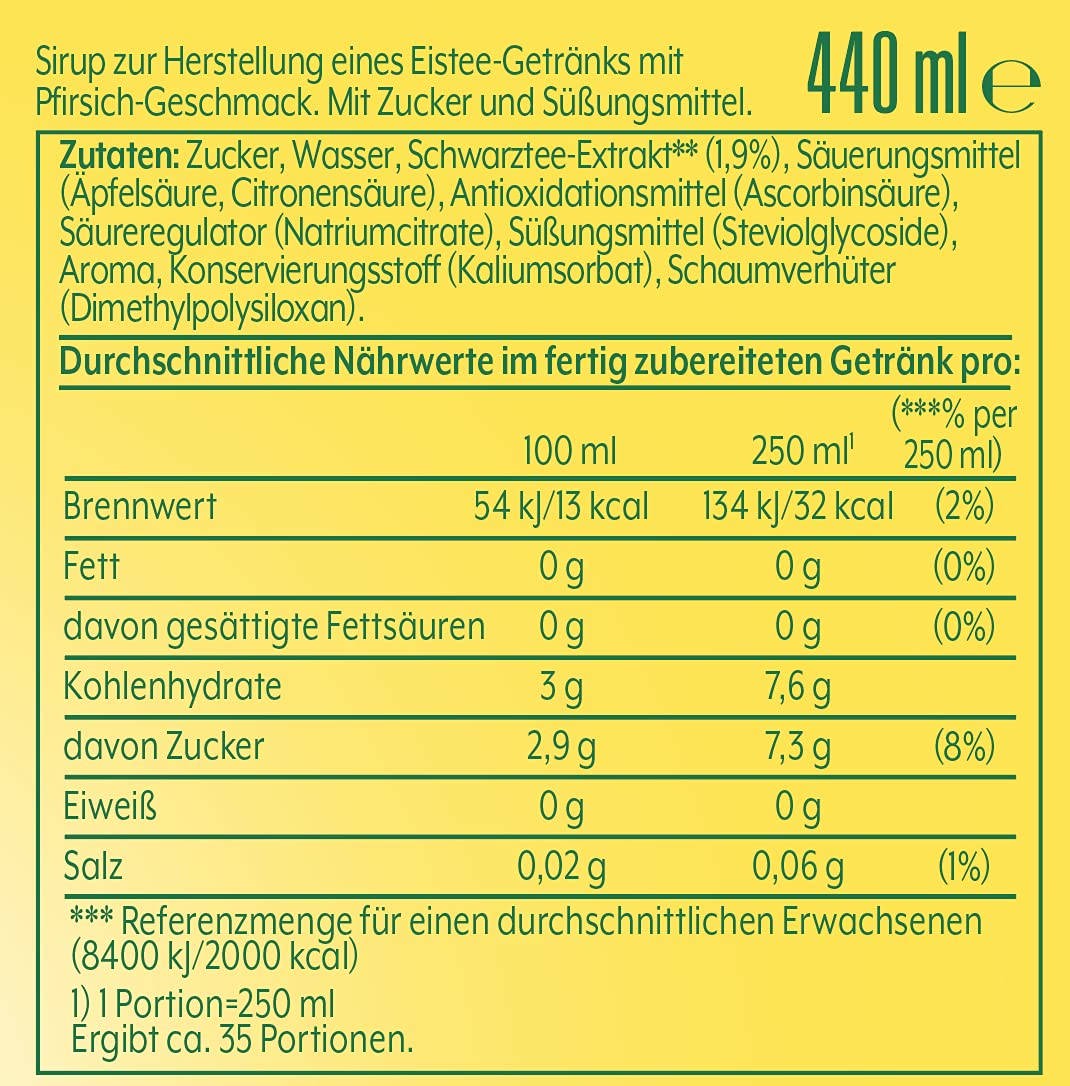 Zucker, Wasser, Schwarztee-Extrakt (1,9%), Säuerungsmittel (Äpfelsäure, Citronensäure), Antioxidationsmittel (Ascorbinsäure), Säureregulator (Natriumcitrate), Süßungsmittel (Steviolglycoside), Aroma, Konservierungsstoff (Kaliumsorbat), Schaumverhüter (Dimethylpolysiloxan)